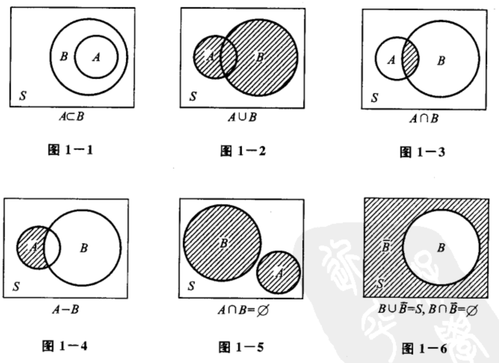 - 逆事件:A∪B=S,称为逆事件或者对立事件,B相对于A记作A