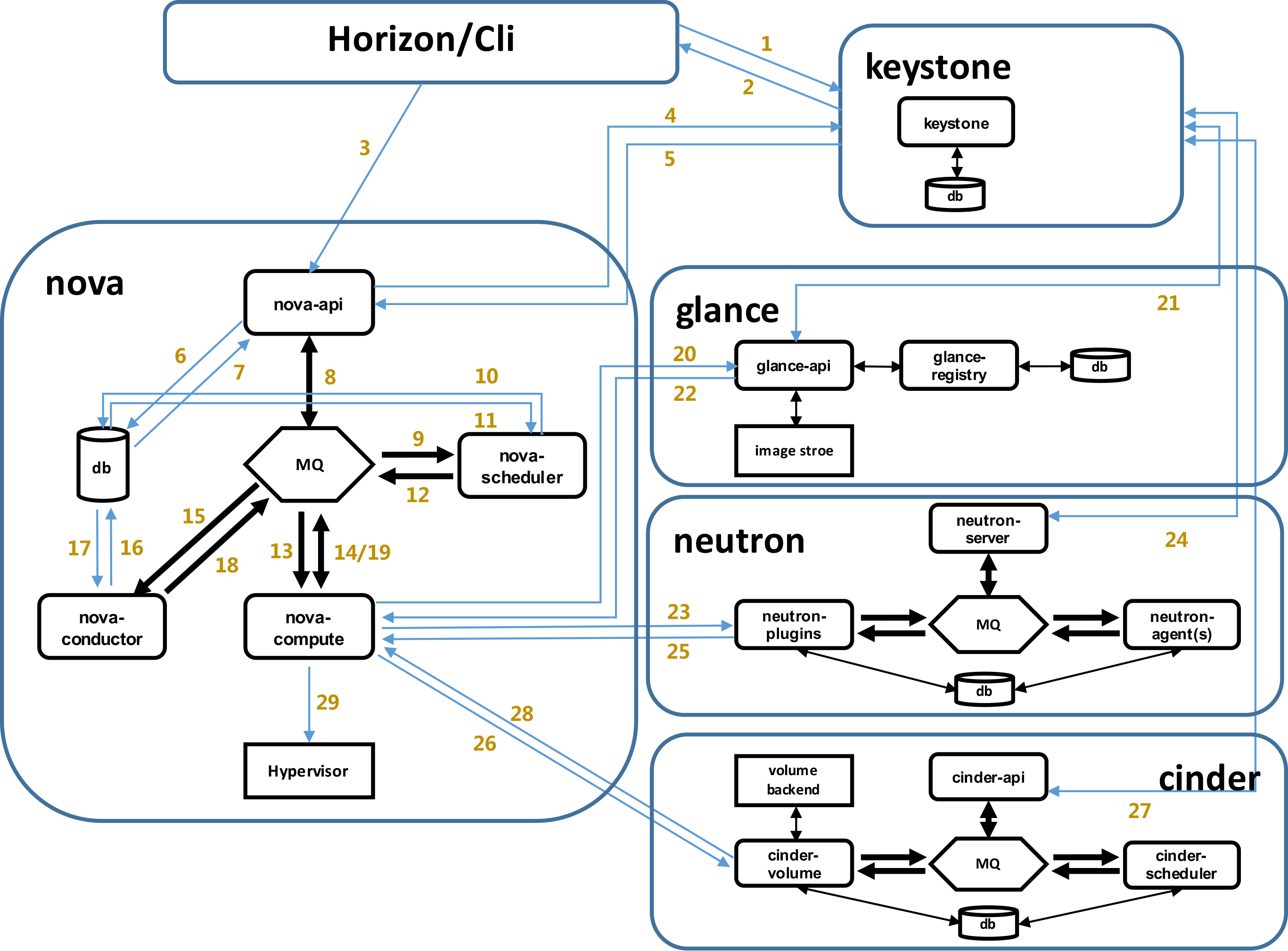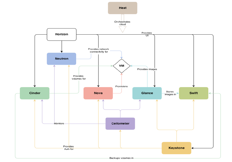 - 人机交互:OpenStack提供人机接口,外界可以通过API、命令行或图形界面的方式参与OpenStack进行交互。