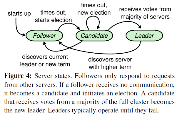 所有节点启动时都是Follower状态,在一段时间内如果没有收到来自Leader的心跳,从Follower切换到Candidate,发起选举。如果收到大多数的投票(含自己的一票)则切换到Leader状态。果发现其他节点比自己更新,则主动切换到Follower。