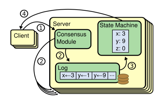 - 它同其它Server上的一致性模块进行通信,确保每一个日志最终包含相同的请求且顺序也相同