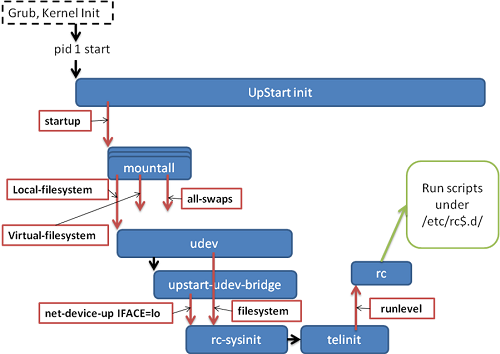 rc-sysinit调用telinit。telinit任务会发出runlevel事件,触发执行/etc/init/rc.conf rc.conf执行/etc/rc$.d/目录下的所有脚本,和System V init非常类似